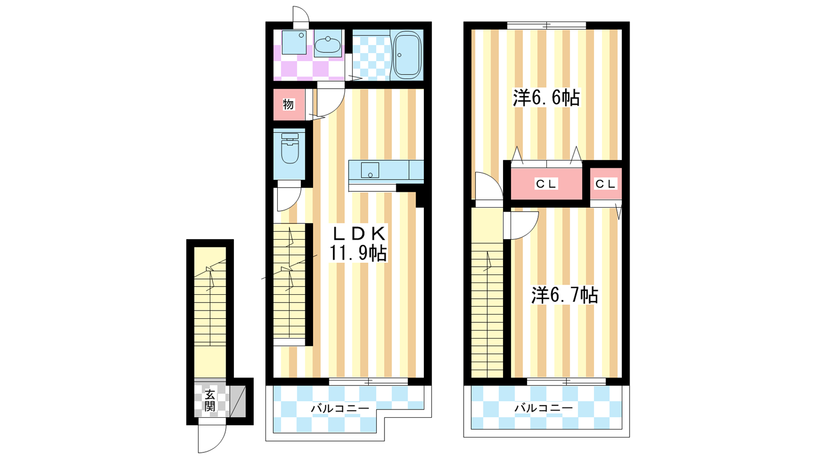 - 洋室6.7帖、洋室6.6帖、LDK12帖