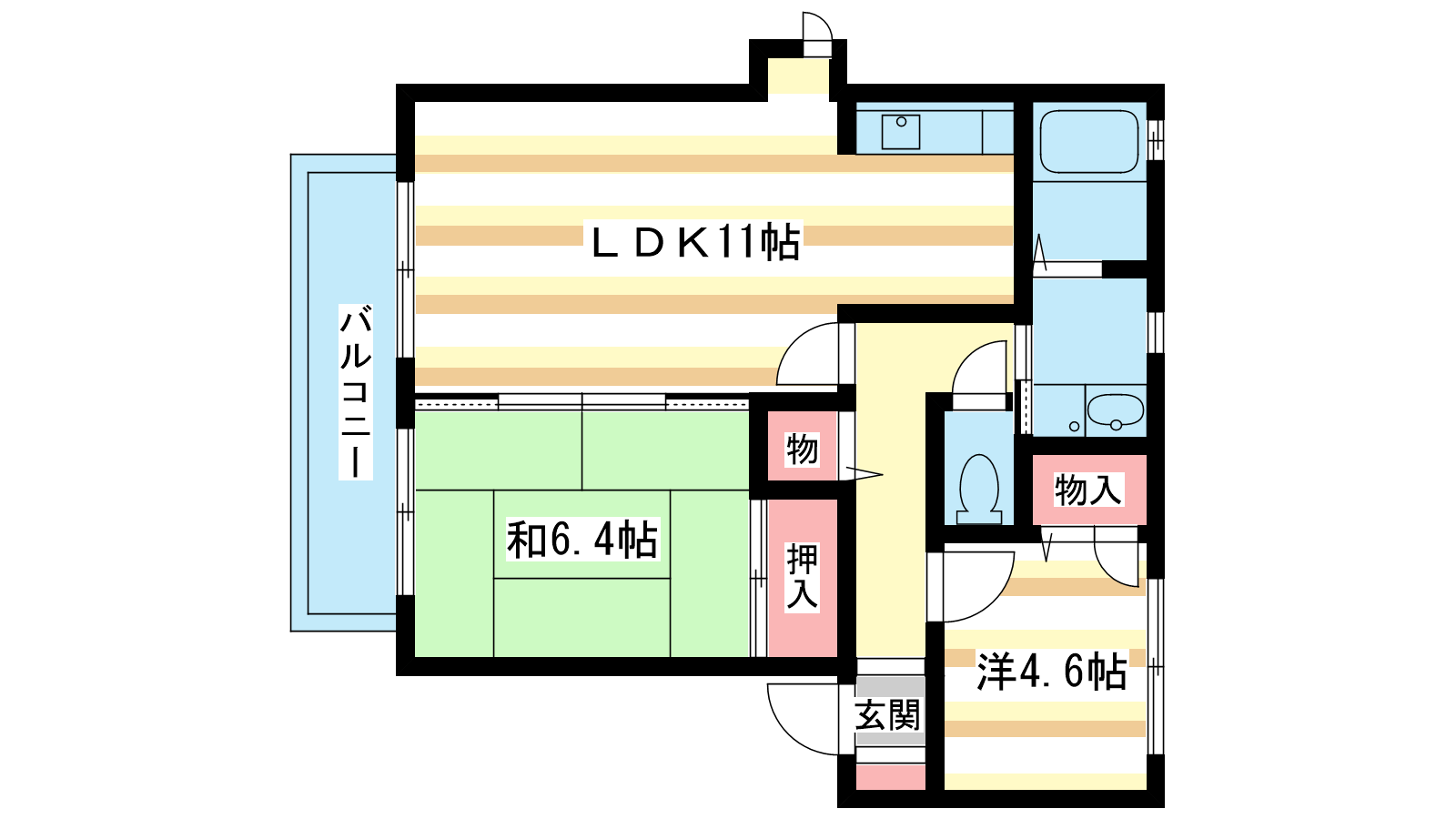- 洋室4.6帖、和室6.4帖、LDK10.9帖