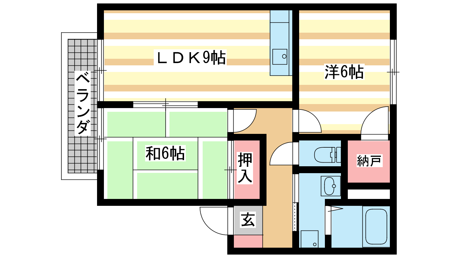 - 洋室6帖、和室6帖、LDK9帖、S1.5帖