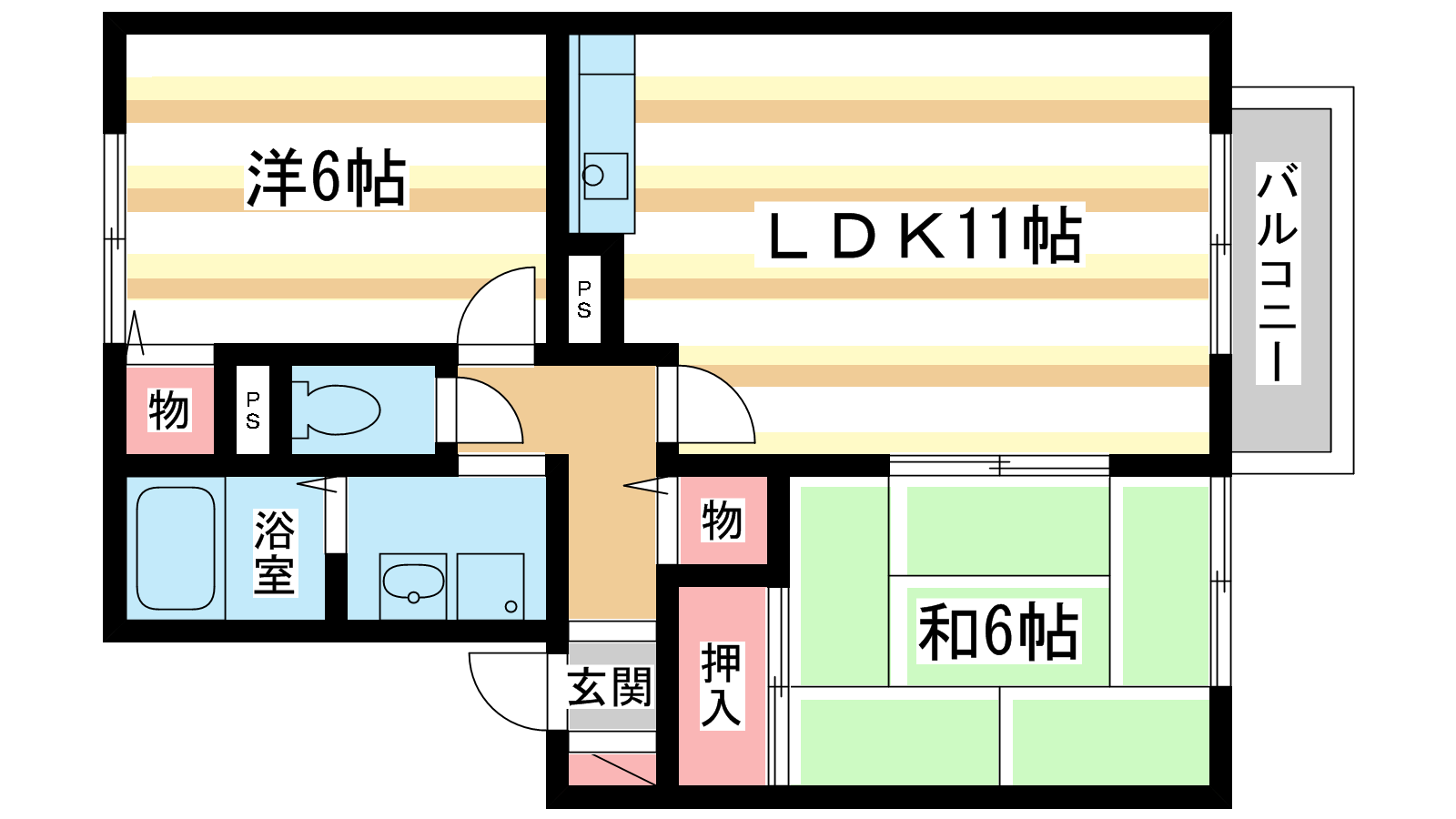 - 洋室6帖、和室6帖、LDK11帖