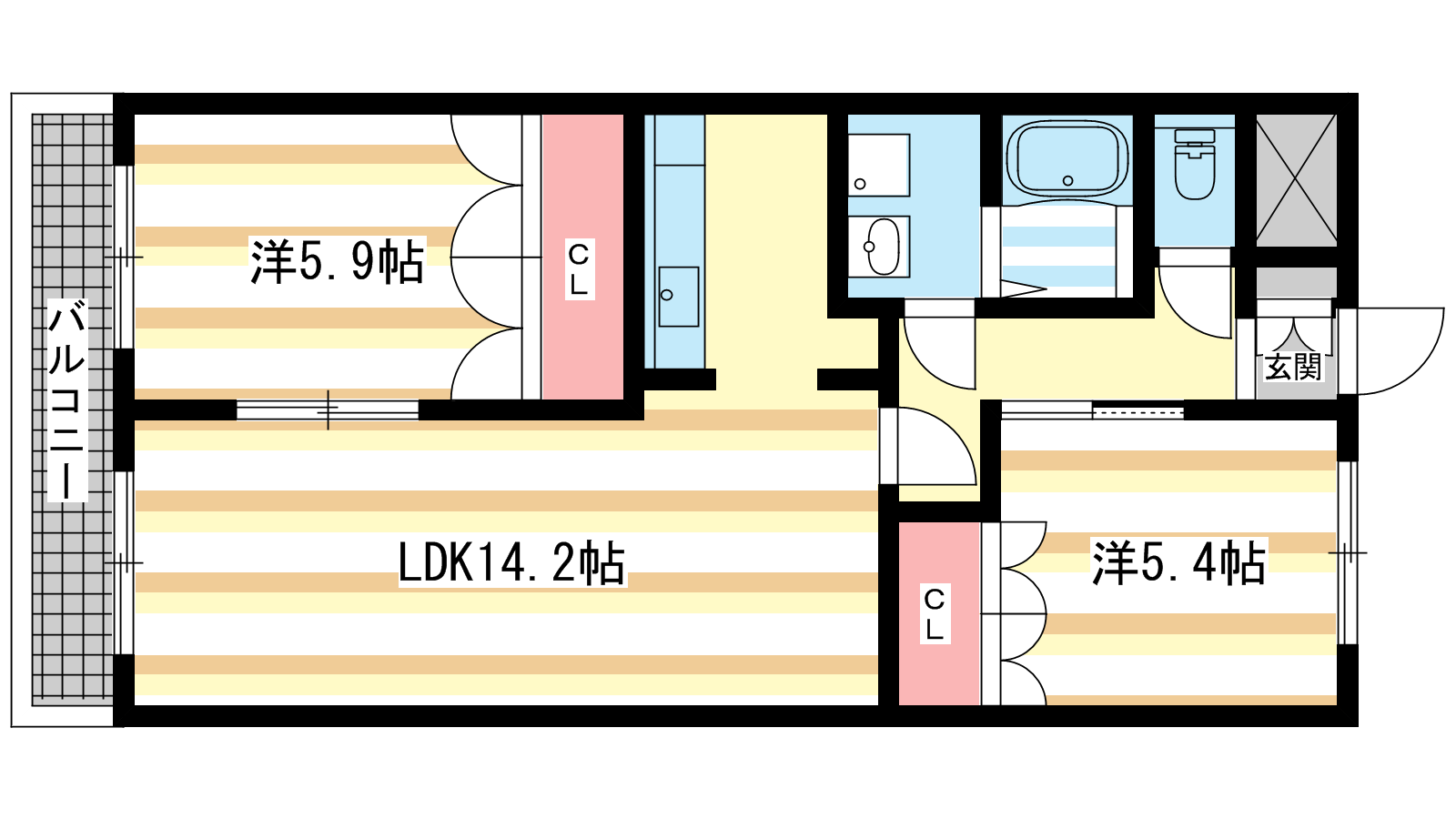 - 洋室5.4帖、洋室5.9帖、LDK14.2帖