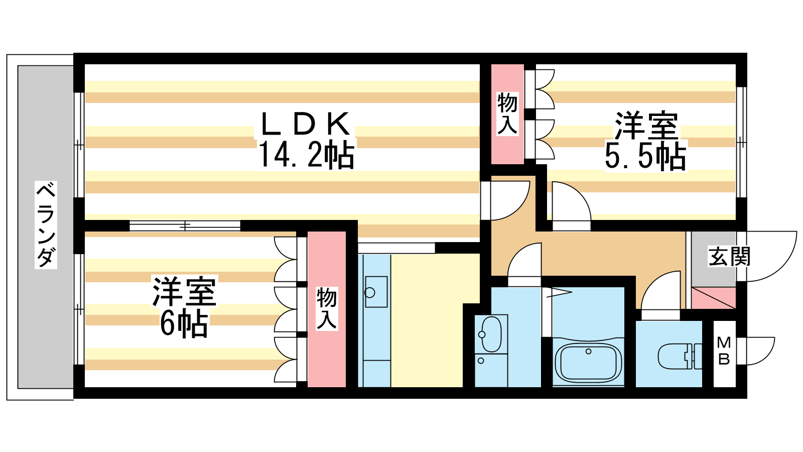 - 洋室6帖、洋室5.5帖、LDK14.2帖