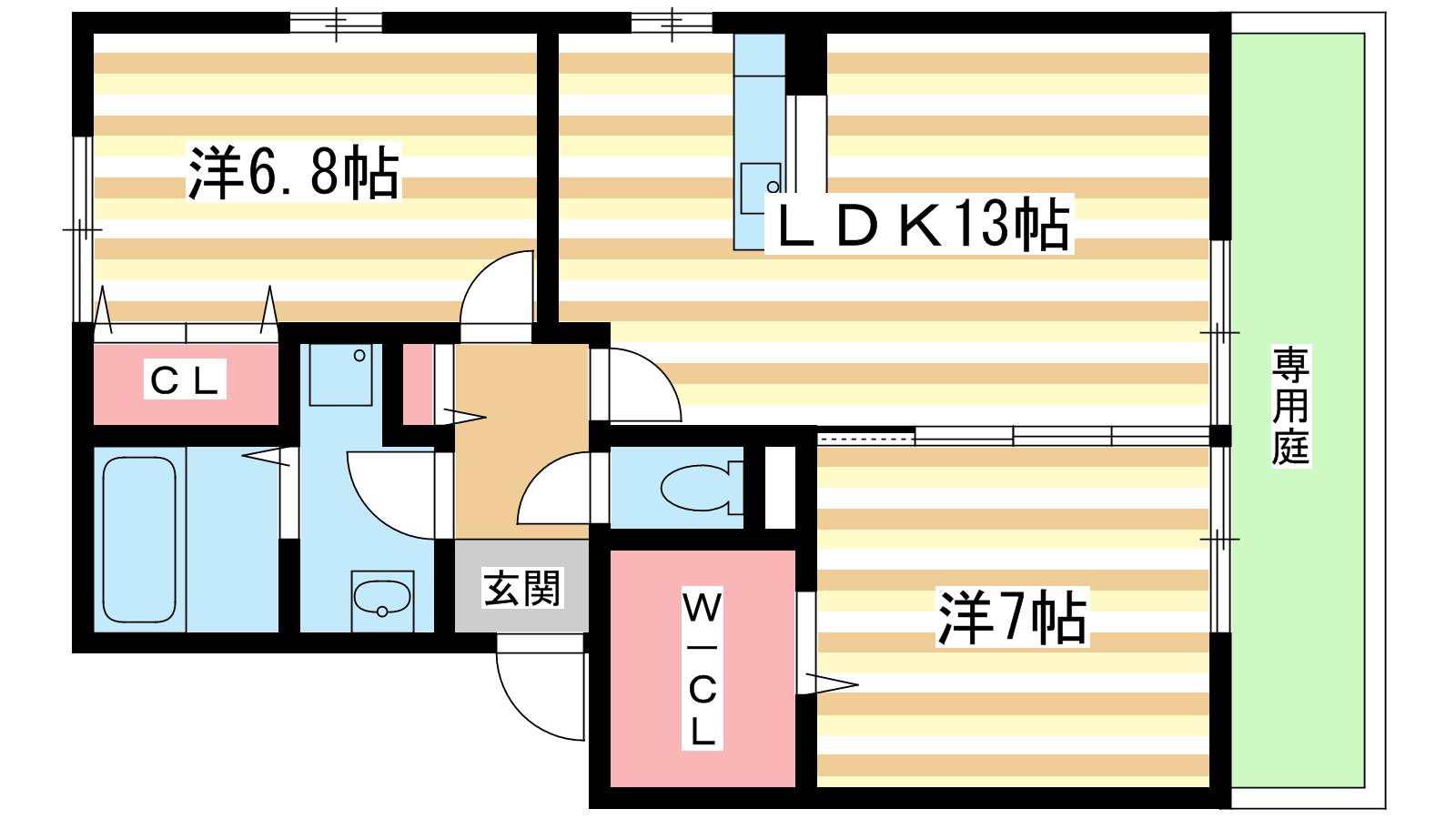 - 洋室6.8帖、洋室7帖、LDK13帖