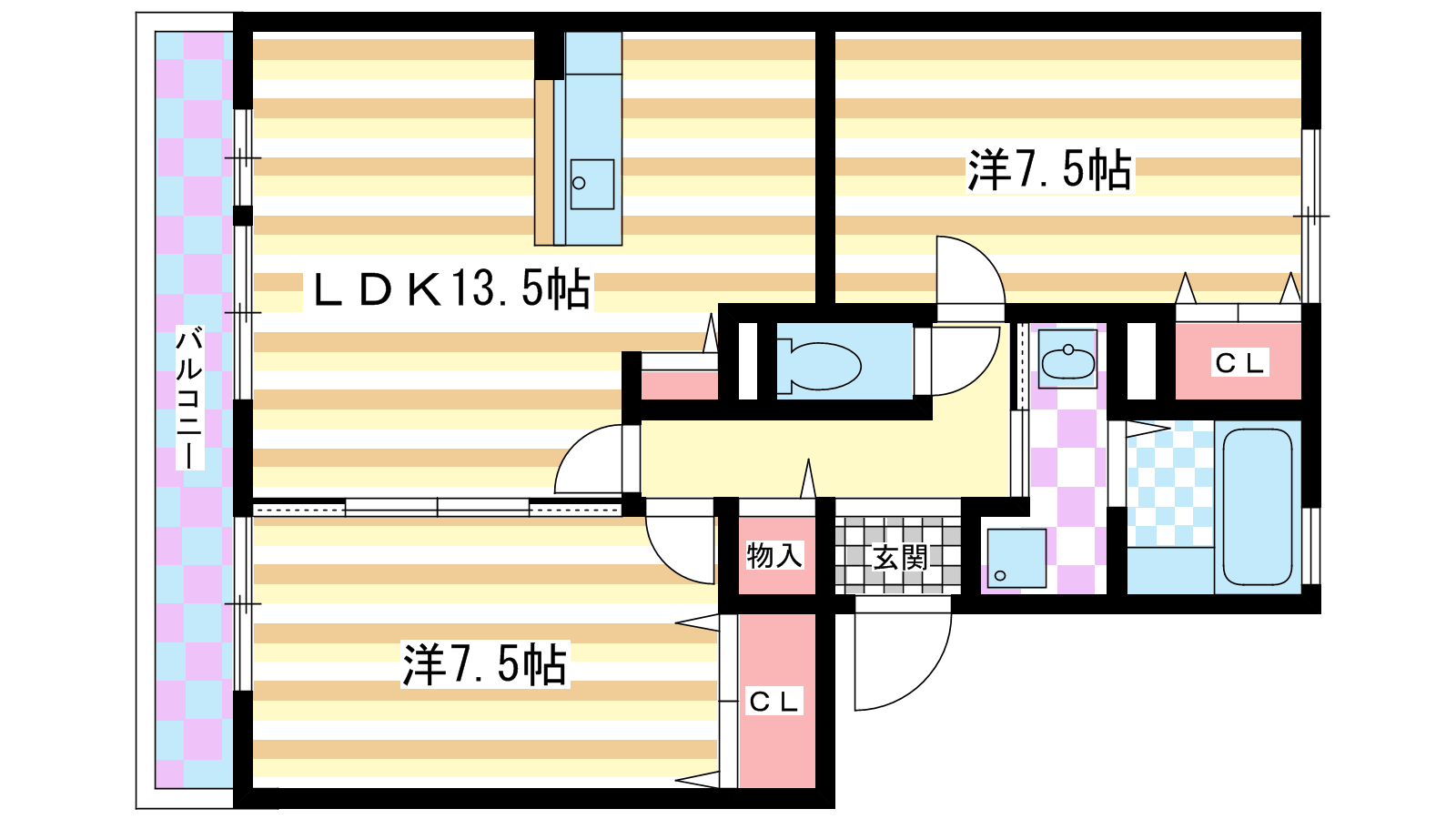 - 洋室7.5帖、洋室7.5帖、LDK13.5帖