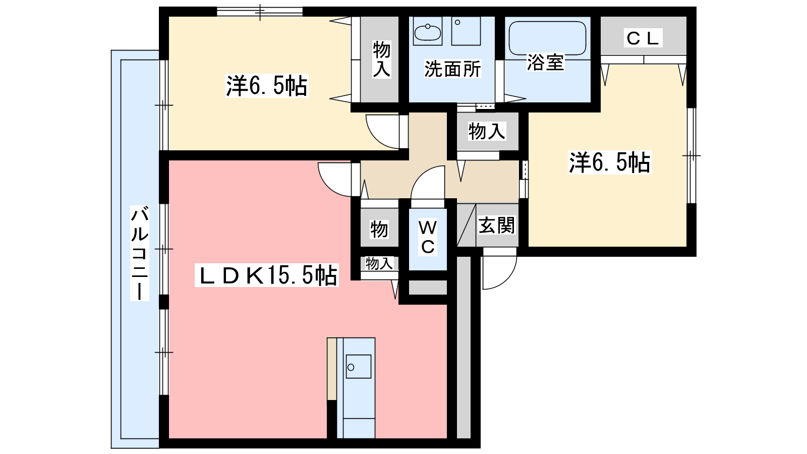 - 洋室6.5帖、洋室6.5帖、LDK15.5帖