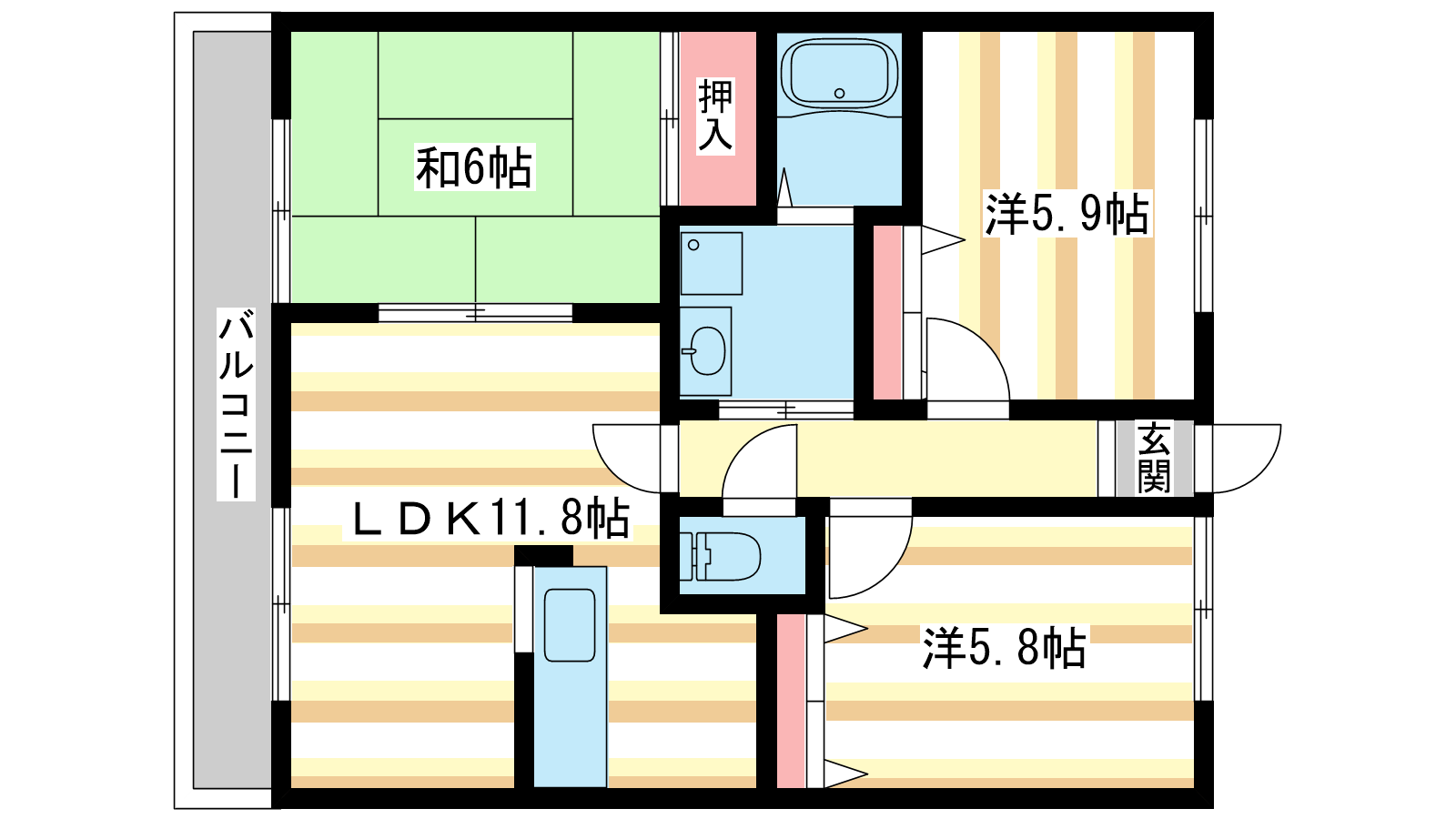 - 洋室7.2帖、洋室5.8帖、和室6帖、LDK11帖