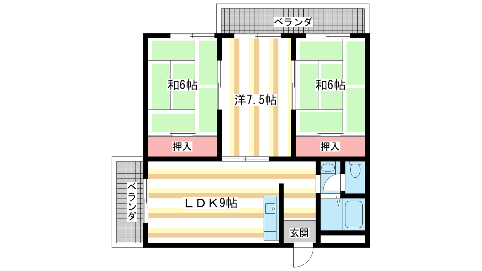 - 和室6帖、和室6帖、洋室7.5帖、LDK9帖