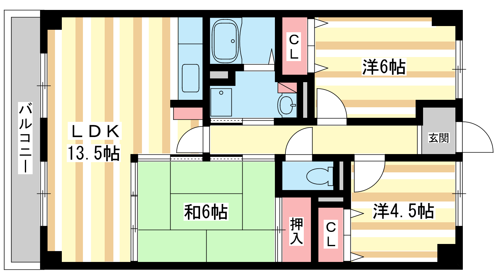- 洋室4.5帖、洋室6帖、和室6帖、LDK13.5帖