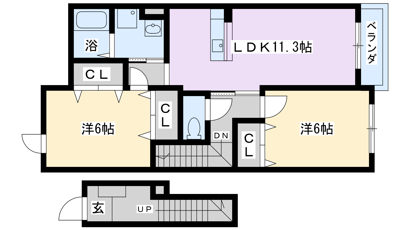 - 洋室6帖、洋室6帖、LDK11.3帖