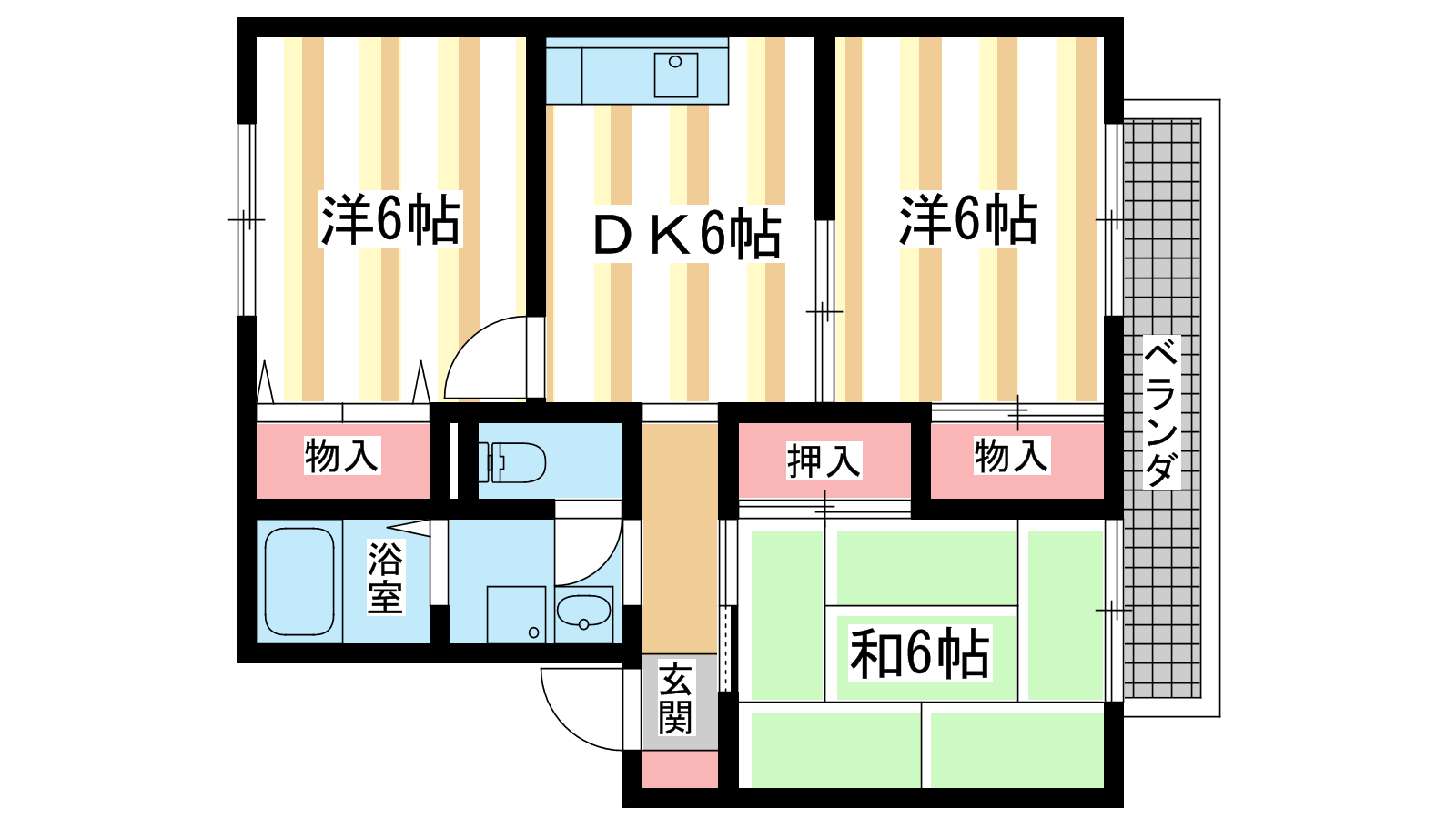 - 洋室6帖、洋室6帖、和室6帖、DK6帖