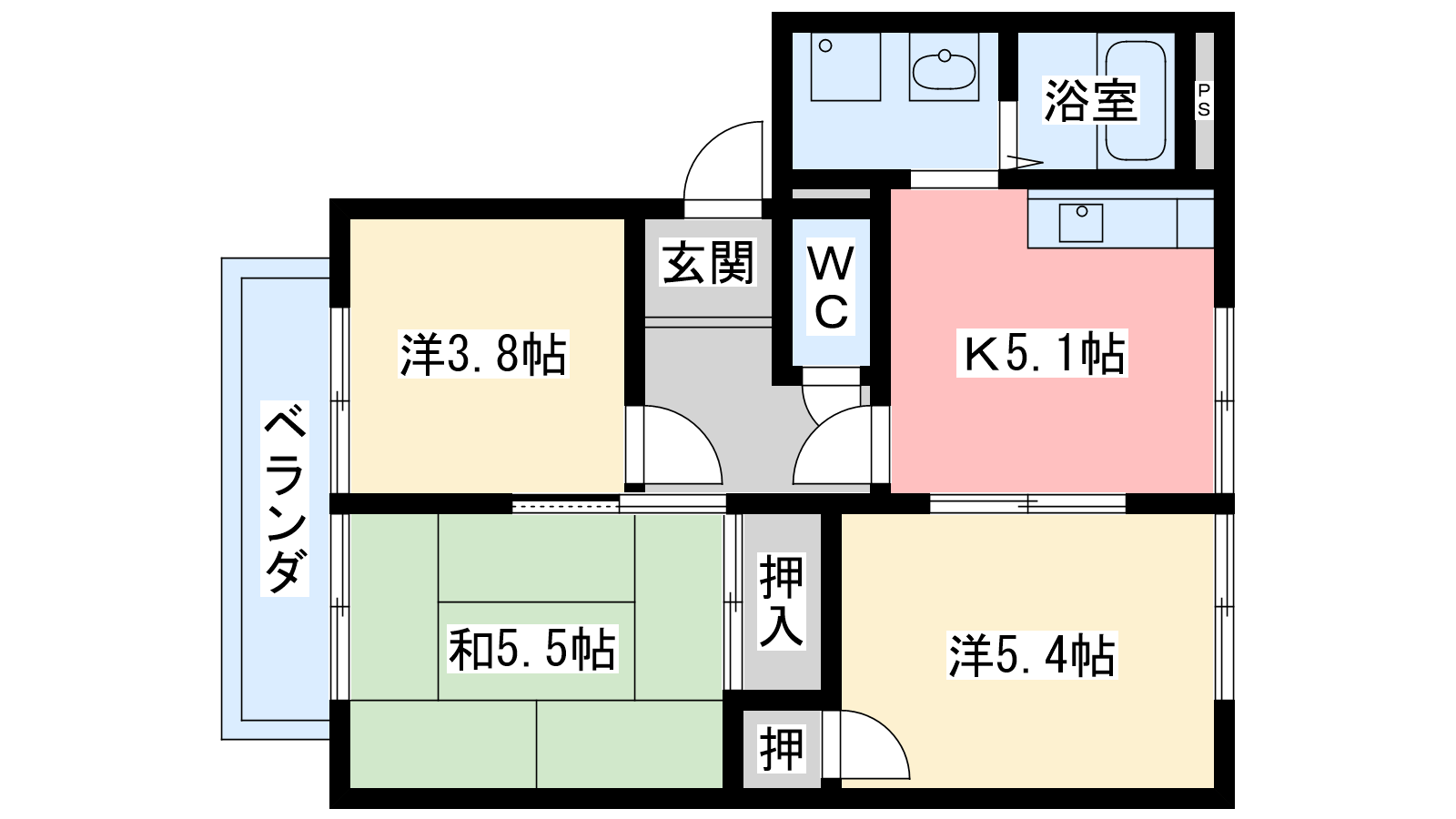- 和室5.5帖、洋室5.4帖、洋室3.8帖、DK5.1帖