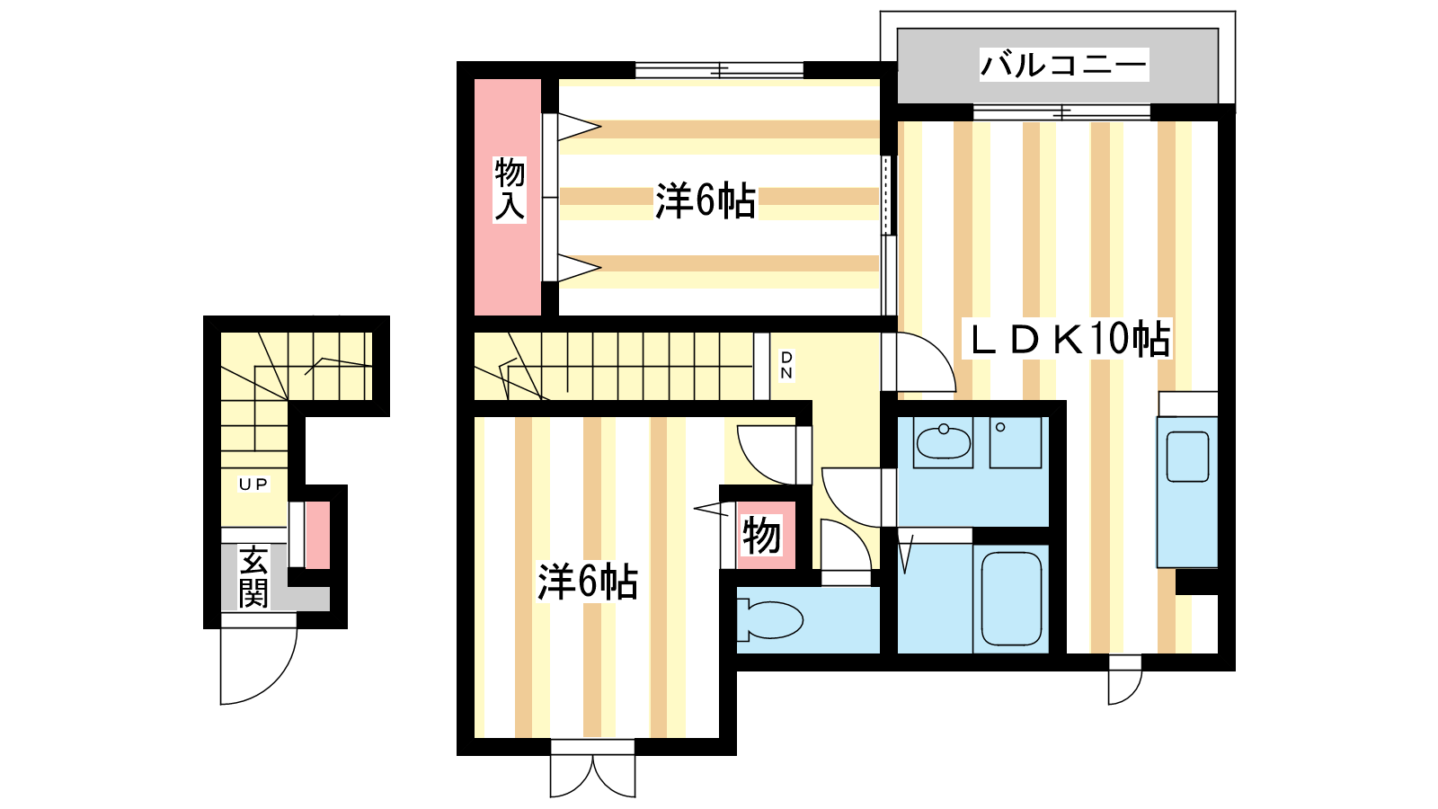 - 洋室6.4帖、洋室6.1帖、LDK10.2帖