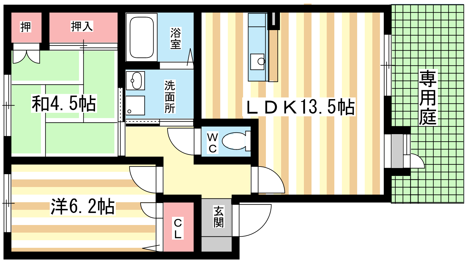 - 洋室6.2帖、和室4.5帖、LDK13.5帖