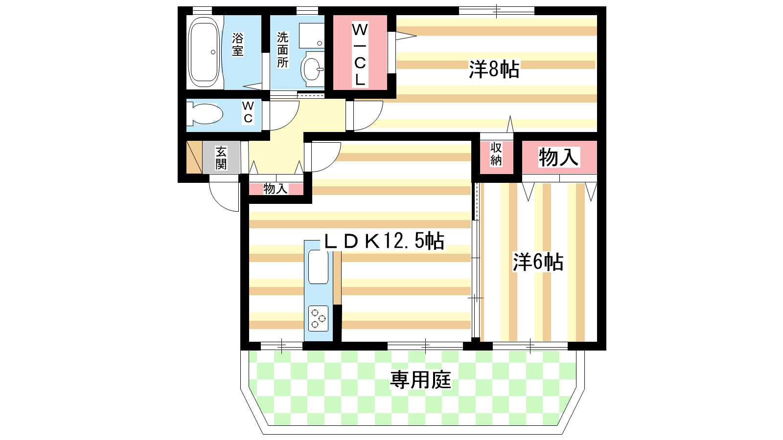 - 洋室8帖、洋室6帖、LDK12.5帖