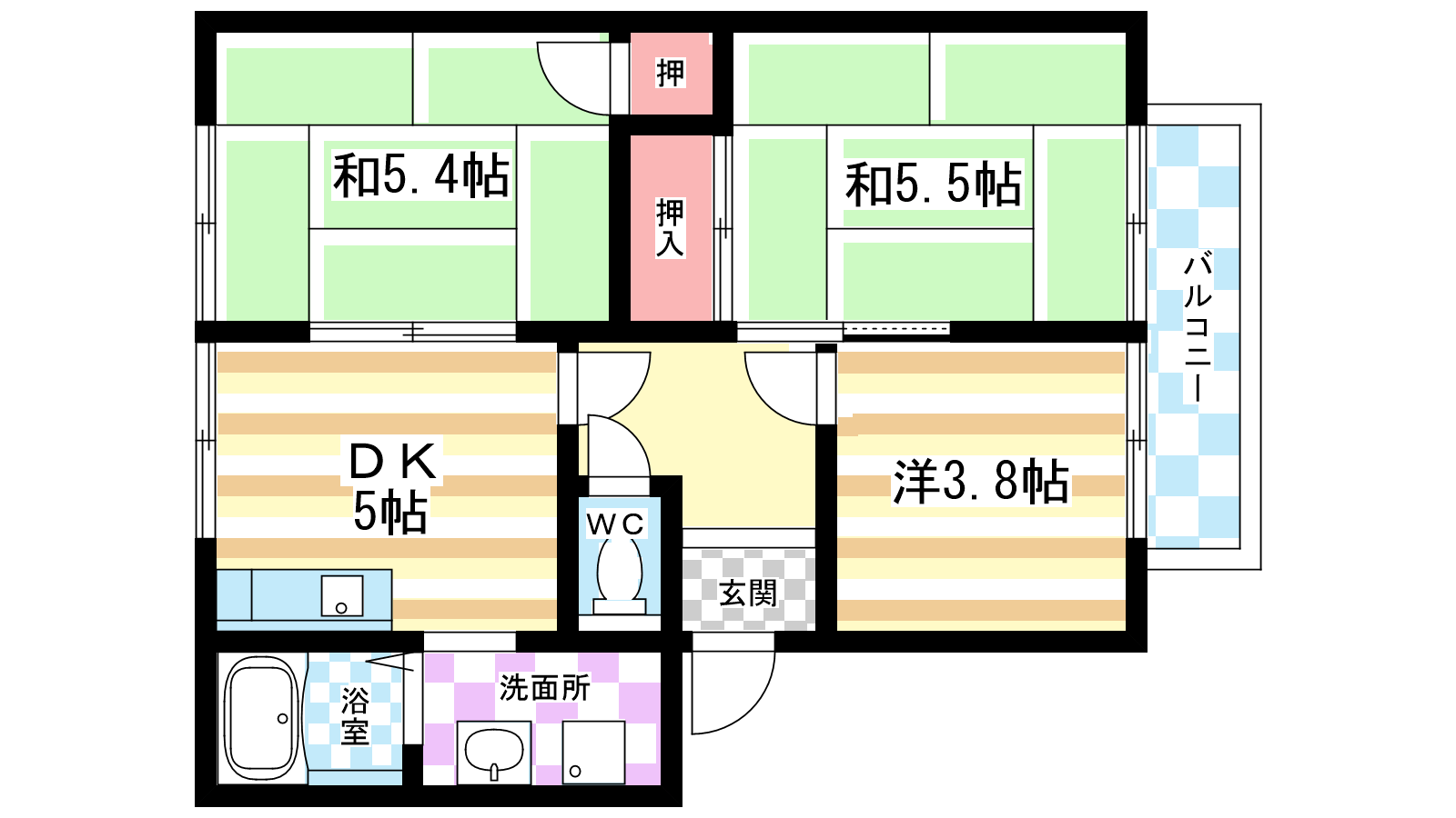 - 洋室3.8帖、和室5.5帖、和室5.4帖、DK5帖