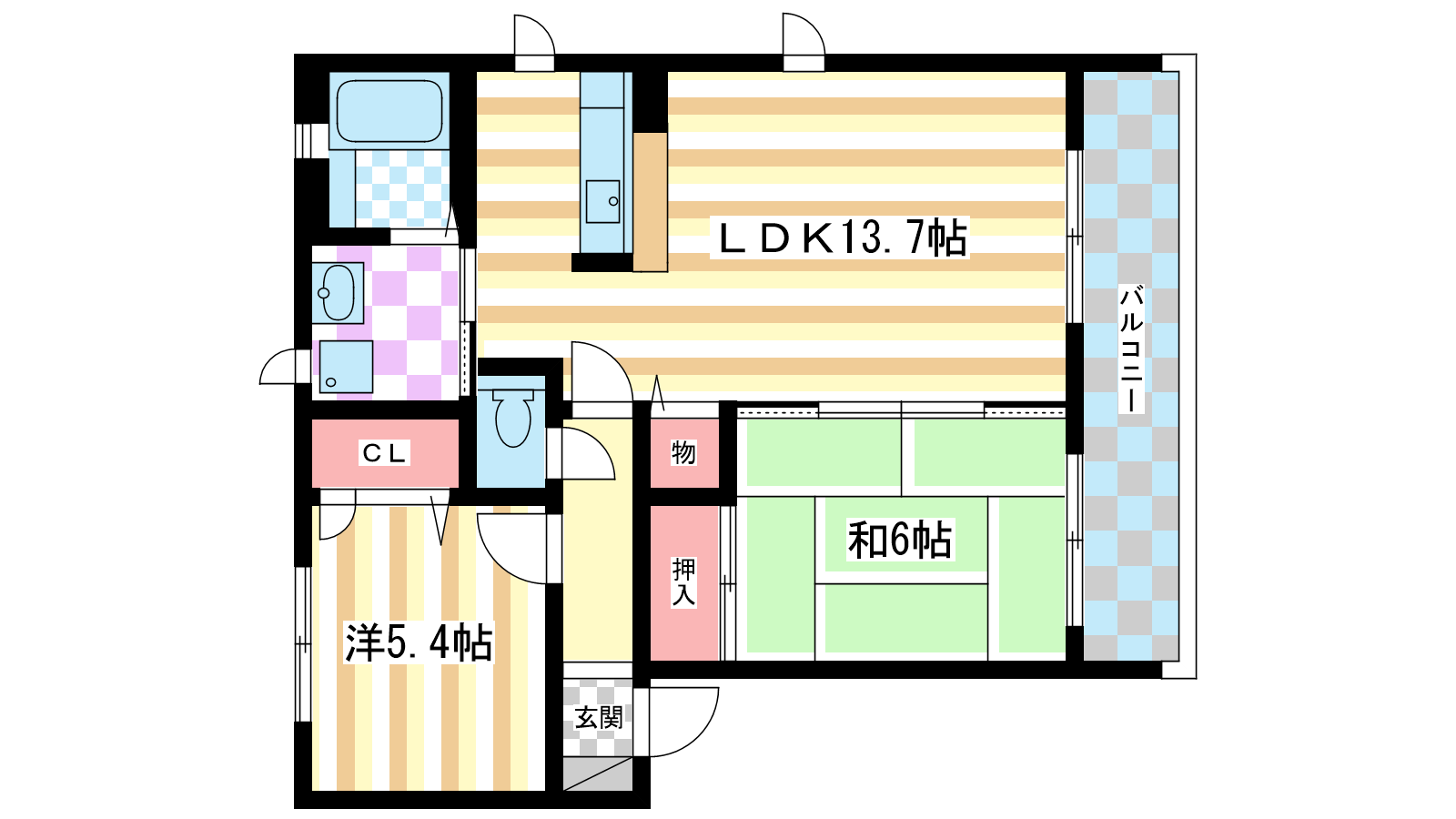 - 洋室5.4帖、和室6帖、LDK13.7帖