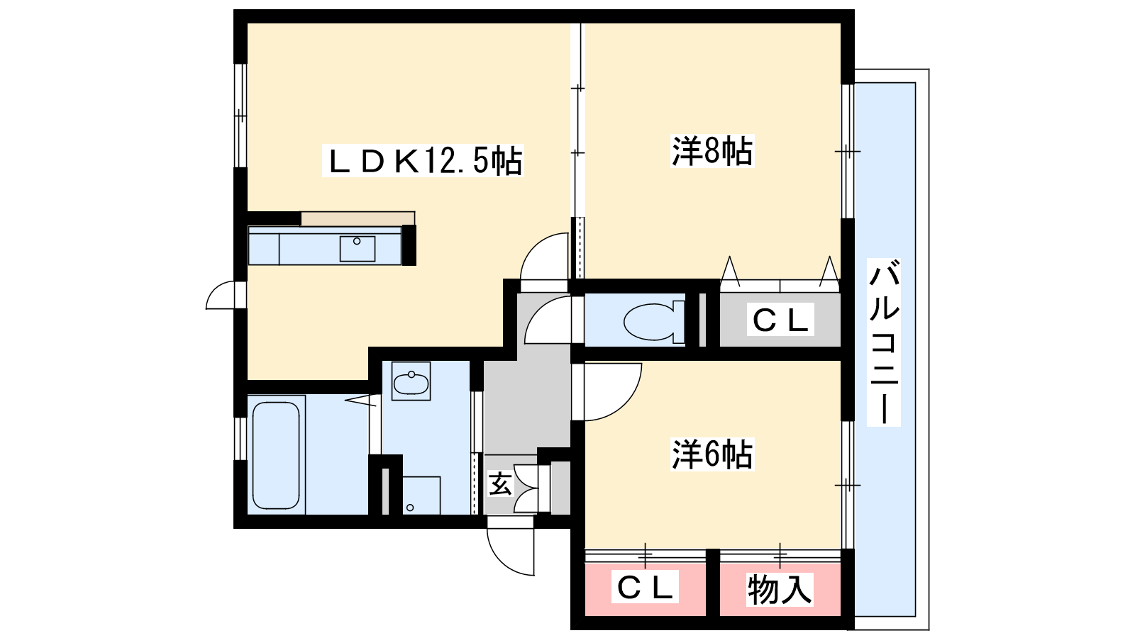 - 洋室8帖、洋室6帖、LDK12.5帖