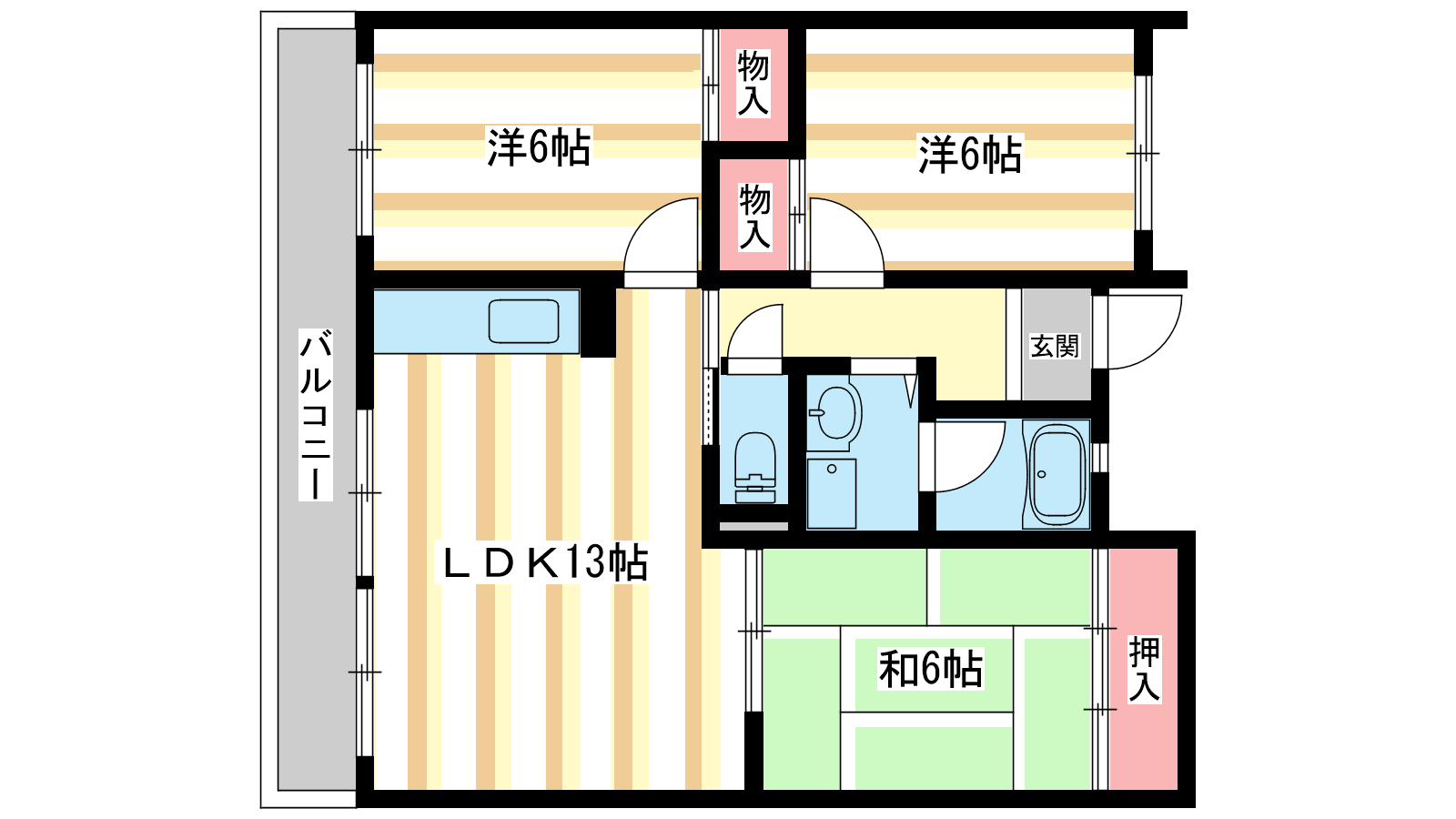 - 和室6帖、洋室6帖、洋室5帖、LDK13帖