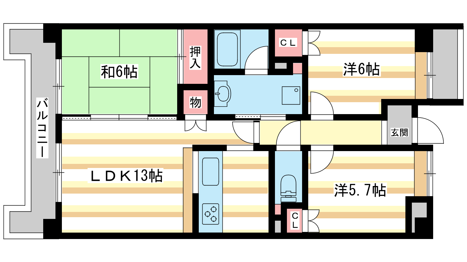 - 洋室6帖、洋室5.7帖、和室6帖、LDK10.5帖