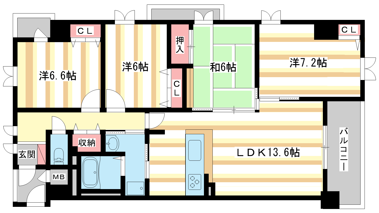 - 洋室6帖、洋室6帖、洋室7帖、和室6帖、LDK15帖