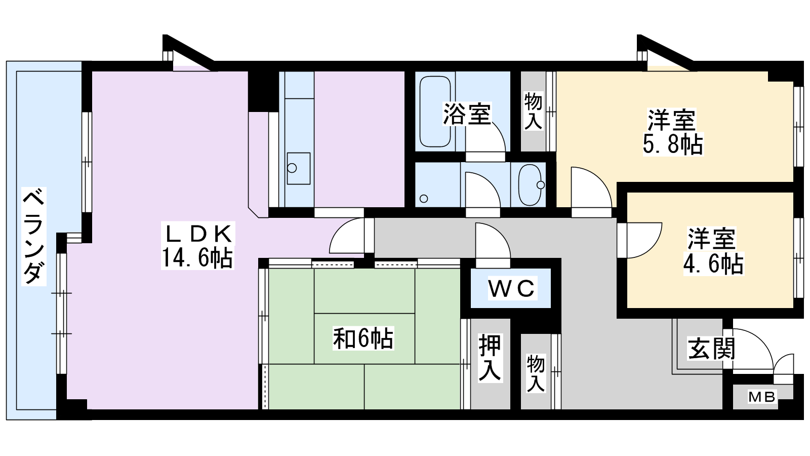 - 和室6帖、洋室5.8帖、洋室4.6帖、LDK14.6帖