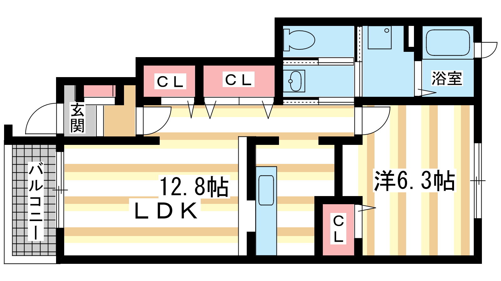 - 洋室6.3帖、LDK12.8帖