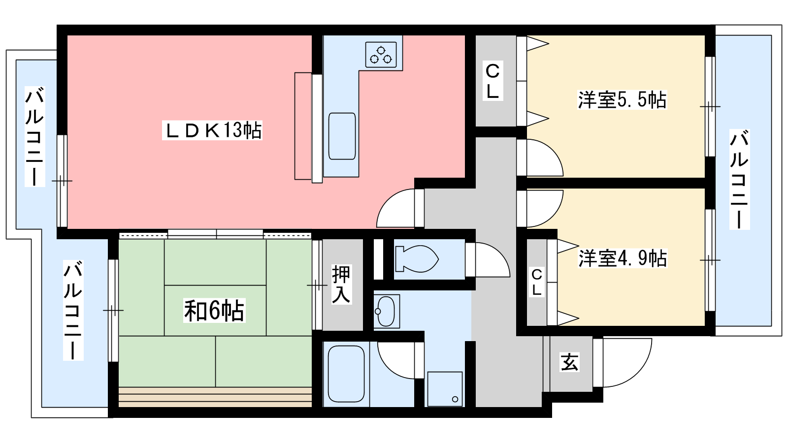 - 洋室5.5帖、洋室4.9帖、和室6帖、LDK13帖