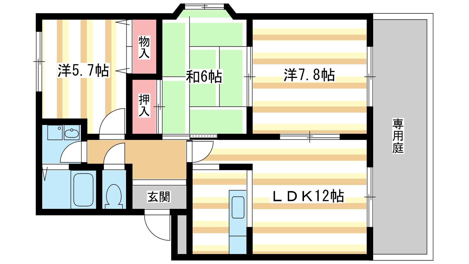 - 洋室7.8帖、洋室5.7帖、和室6帖、LDK12帖