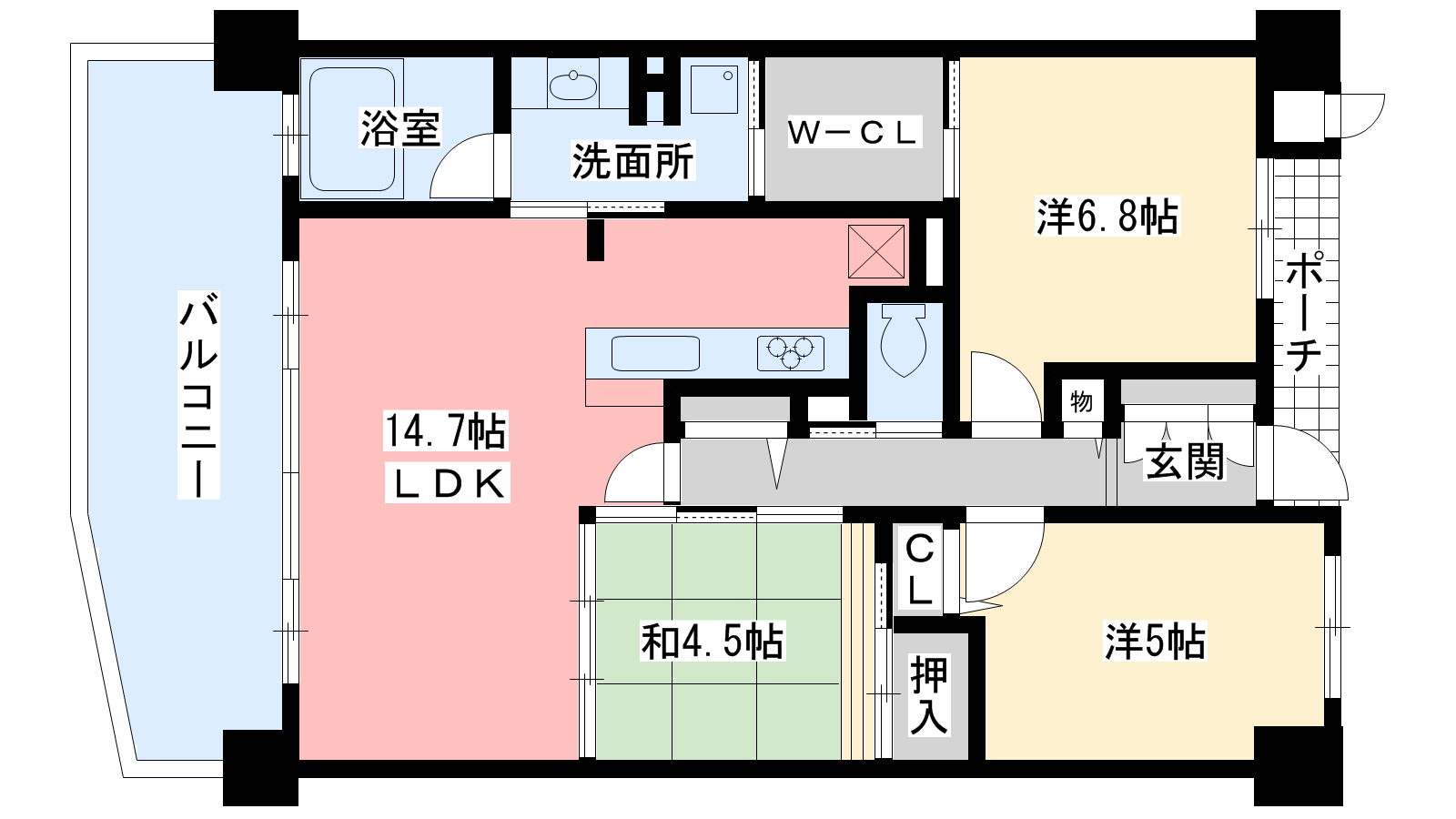 - 和室4.5帖、洋室6.8帖、洋室5帖、LDK14.7帖