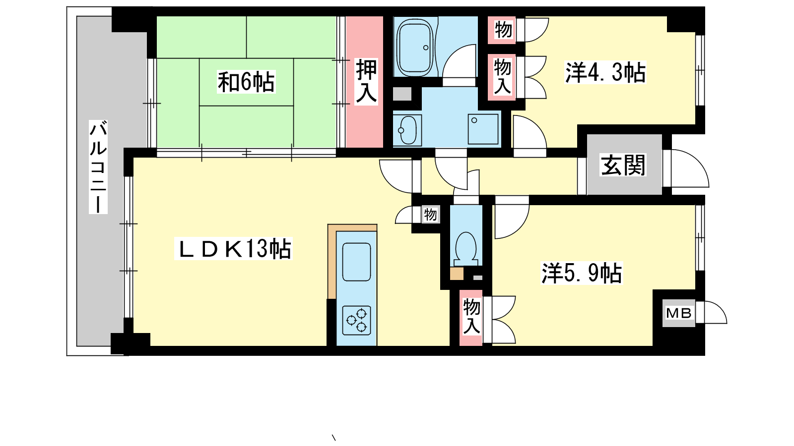 - 洋室4.3帖、洋室5.9帖、和室6帖、LDK13帖