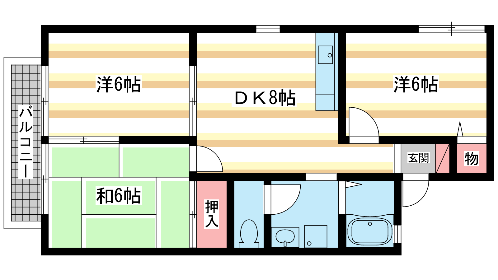 - 洋室6帖、洋室6帖、和室6帖、DK8帖