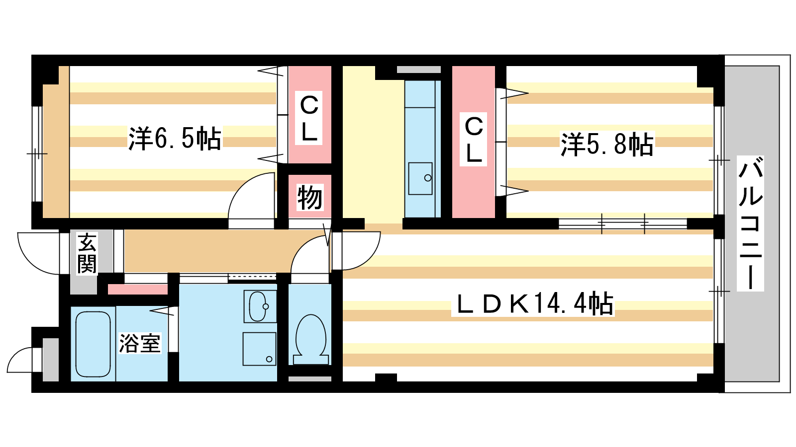 - 洋室6.5帖、洋室5.8帖、LDK14.4帖