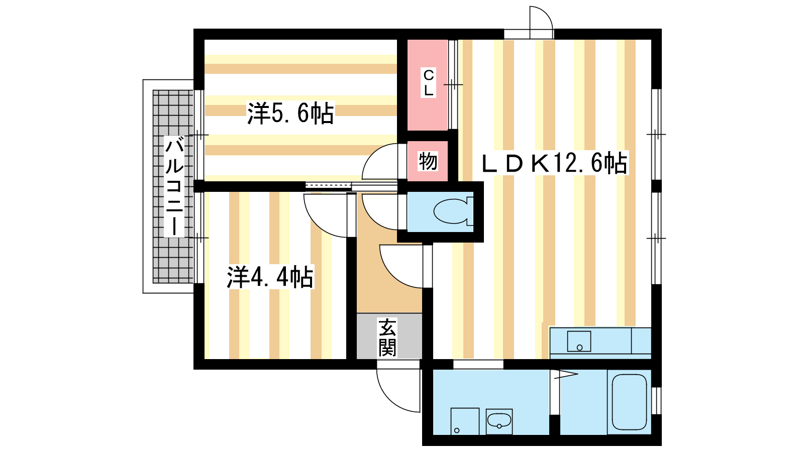 - 洋室4.4帖、洋室5.6帖、LDK12.6帖