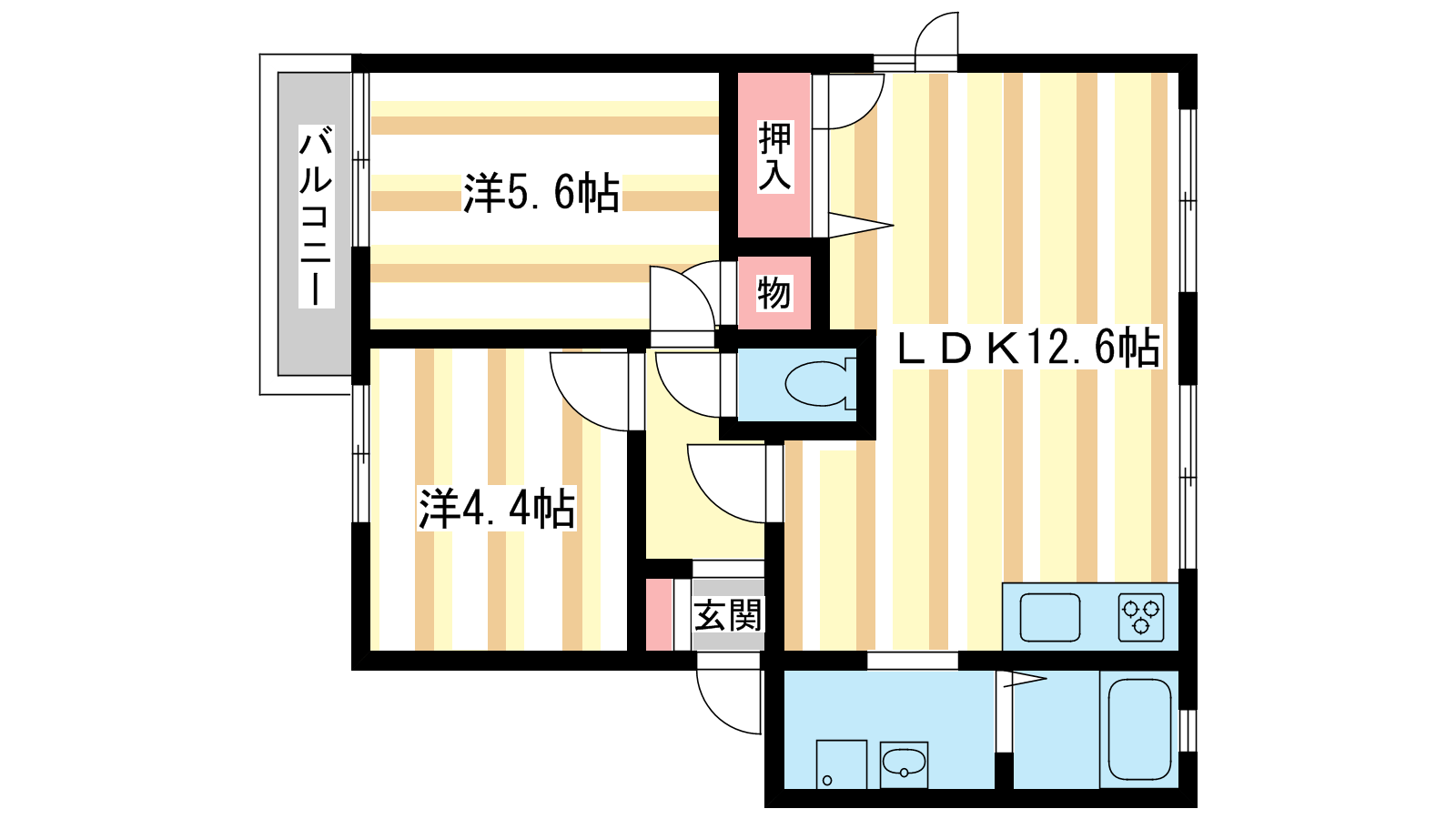 - LDK12.6帖、洋室4.4帖、洋室5.6帖