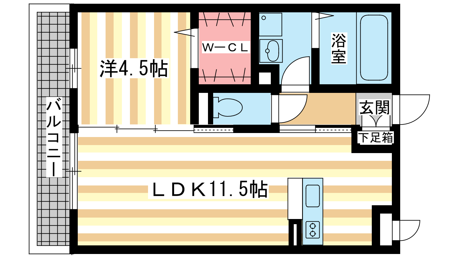 - 洋室4.5帖、LDK11.5帖、S2帖