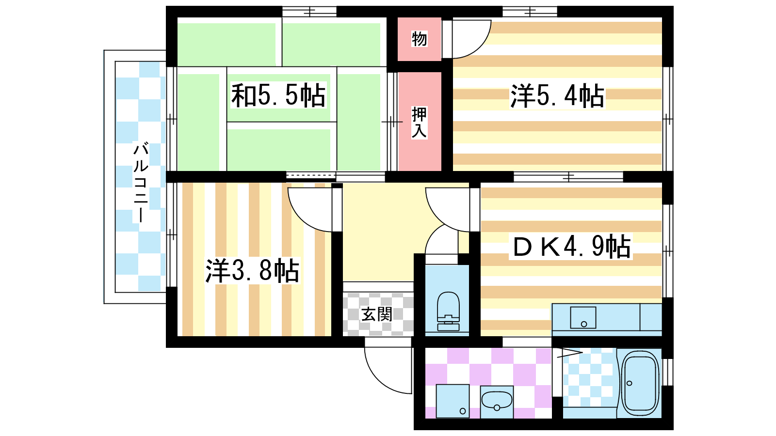 - 洋室5.4帖、洋室3.8帖、和室5.5帖、DK4.9帖