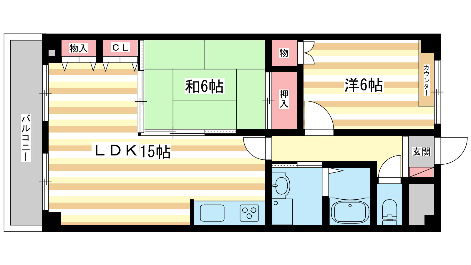 - 洋室6帖、和室6帖、LDK15帖