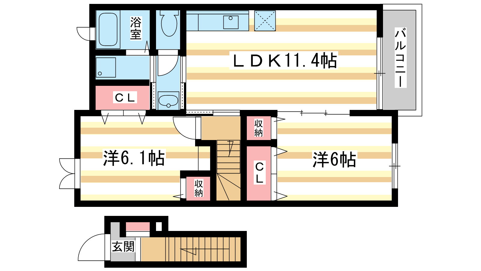 - 洋室6帖、洋室6.1帖、LDK11.4帖
