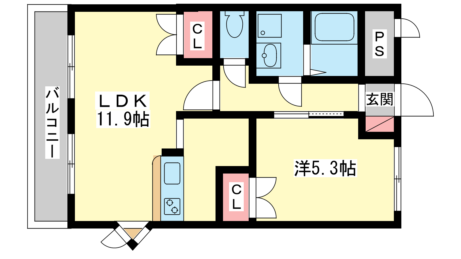- 洋室5.3帖、LDK11.9帖