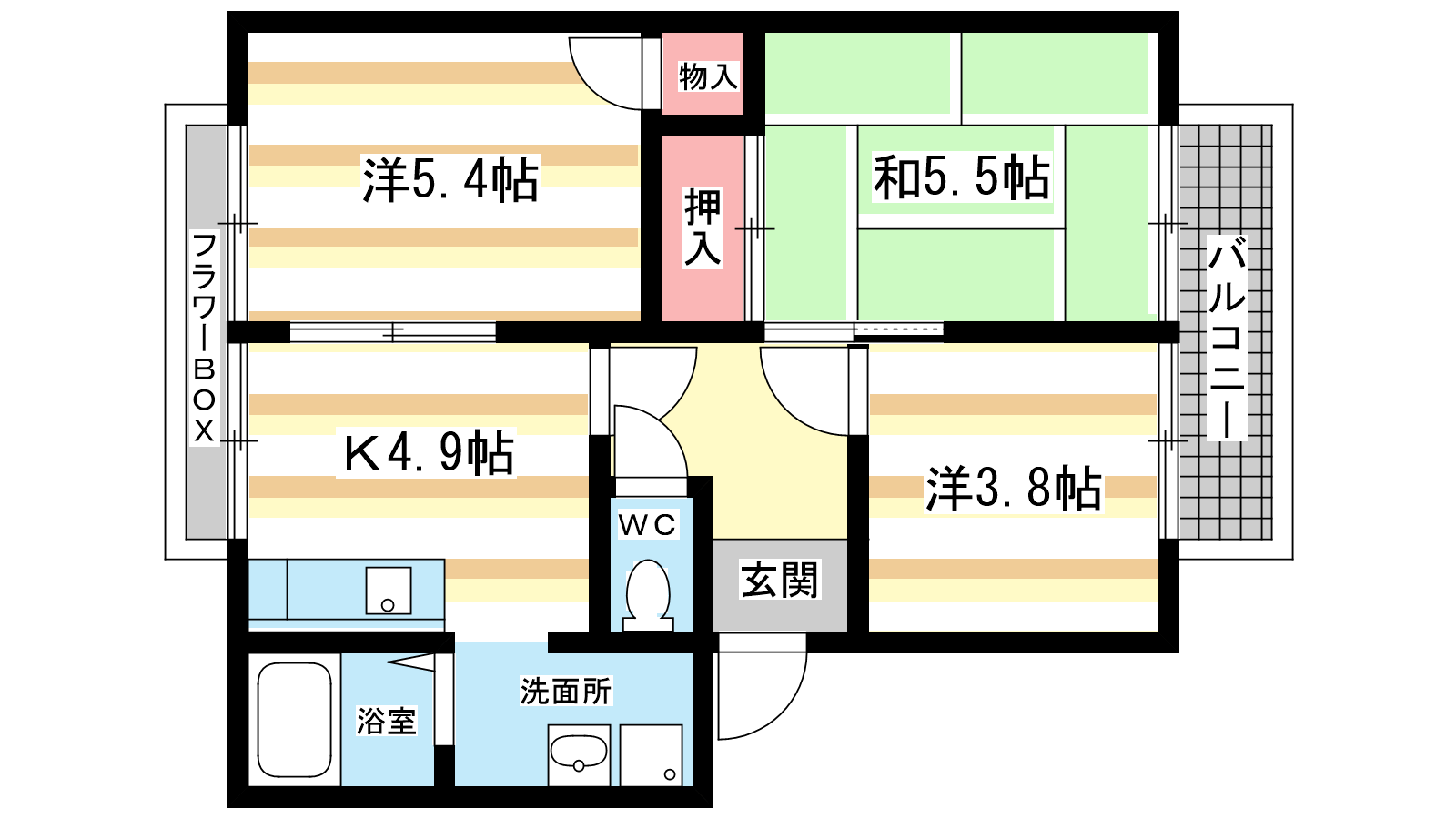- K4.9帖、和室5.5帖、洋室5.4帖、洋室3.8帖
