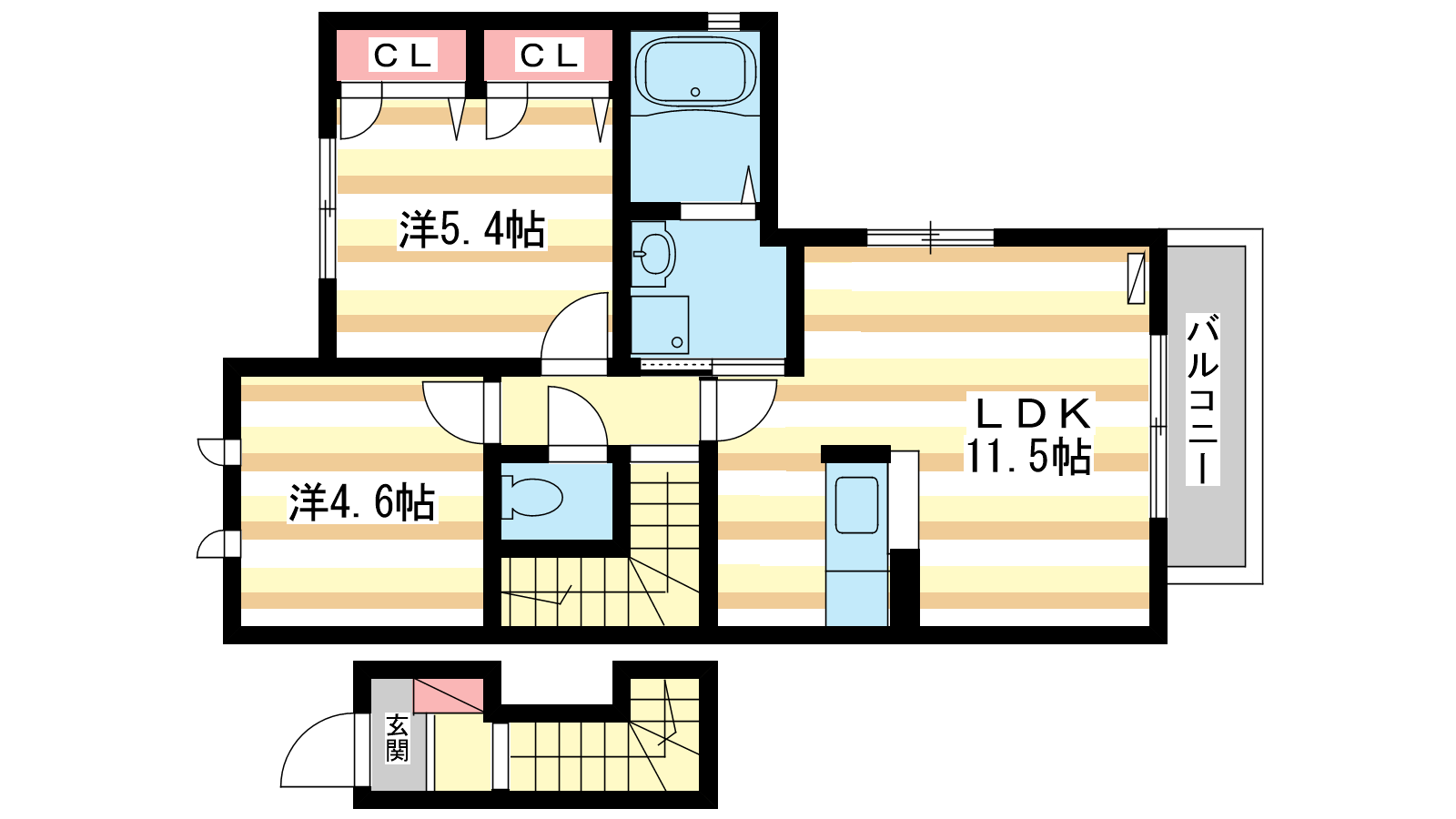 - 洋室5.4帖、洋室4.6帖、LDK11.5帖
