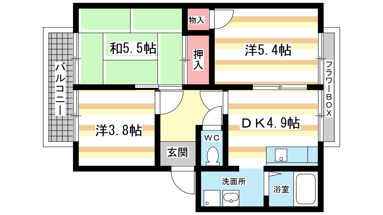 - 和室5.5帖、洋室5.4帖、洋室3.8帖、DK4.9帖