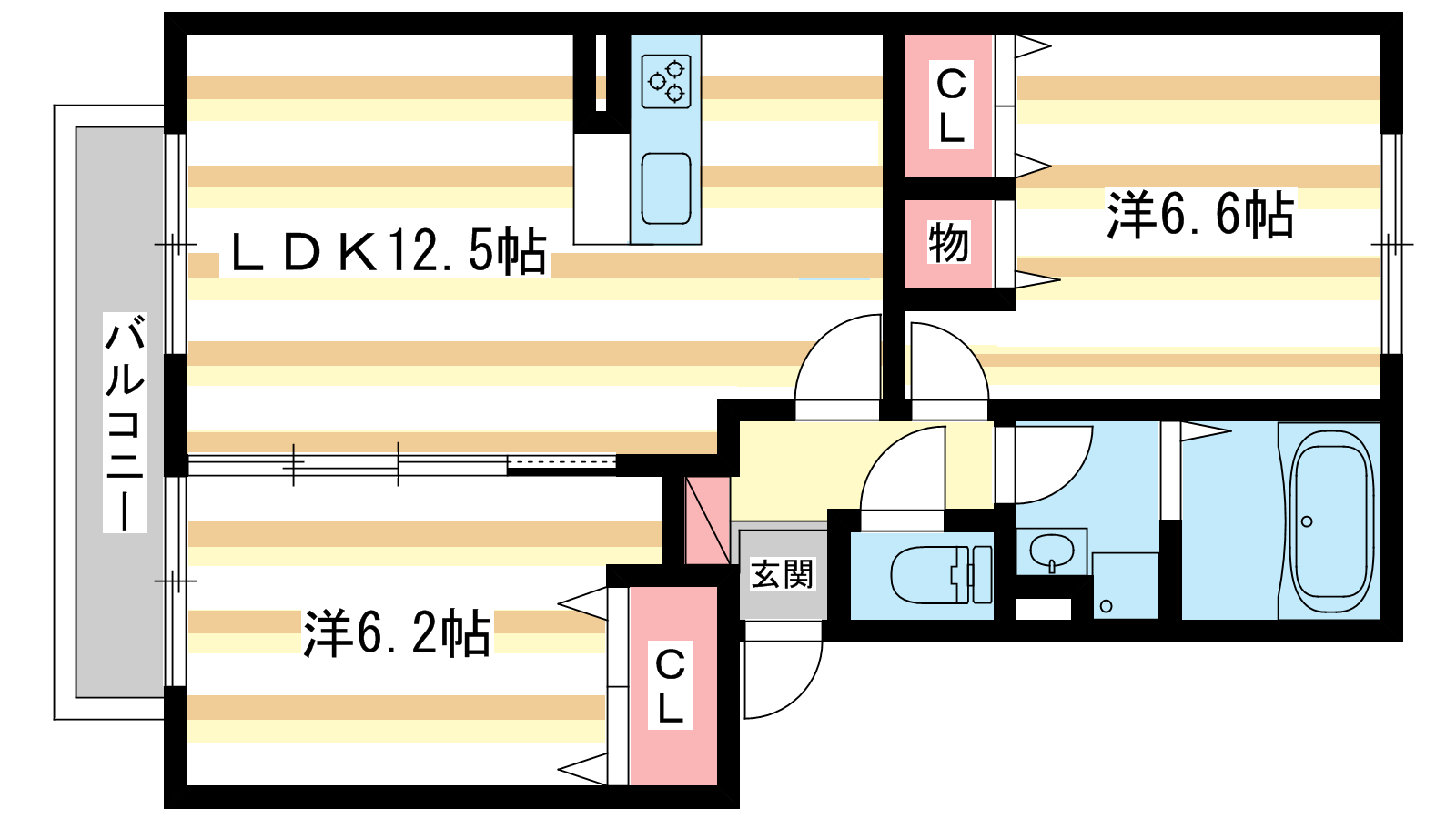 - 洋室6.6帖、洋室6.2帖、LDK12.5帖
