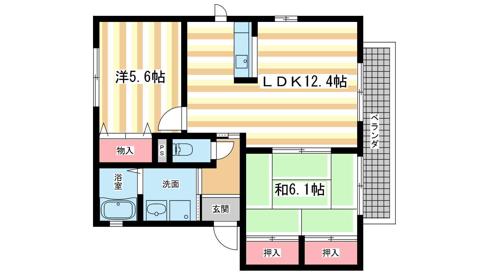 - 和室6.1帖、洋室5.6帖、LDK12.4帖