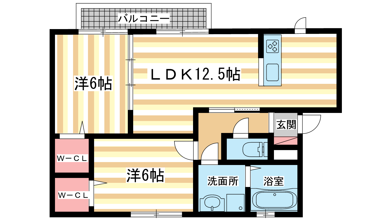 - 洋室6帖、洋室6帖、LDK12.5帖