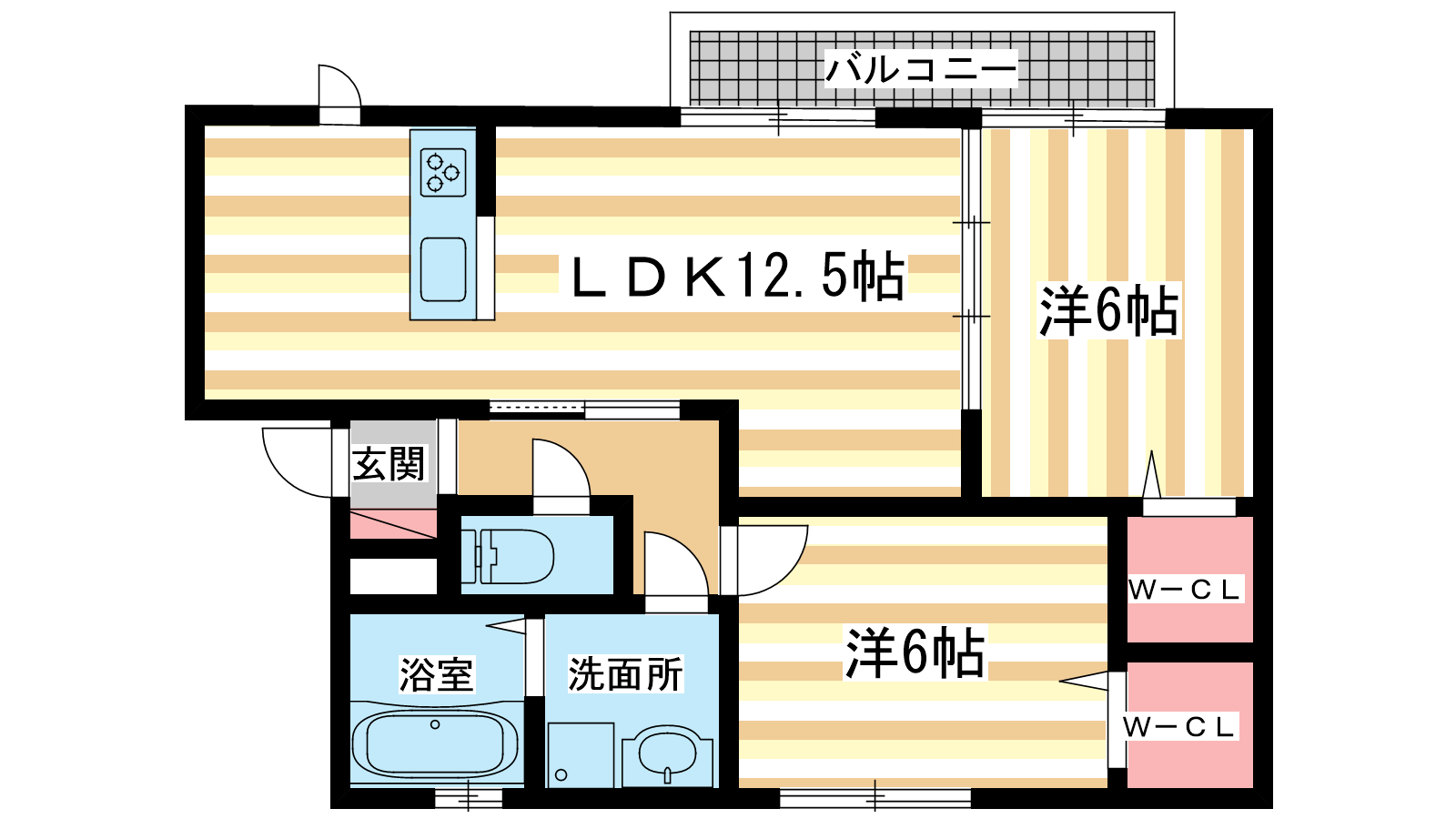 - 洋室6帖、洋室6帖、LDK12.5帖