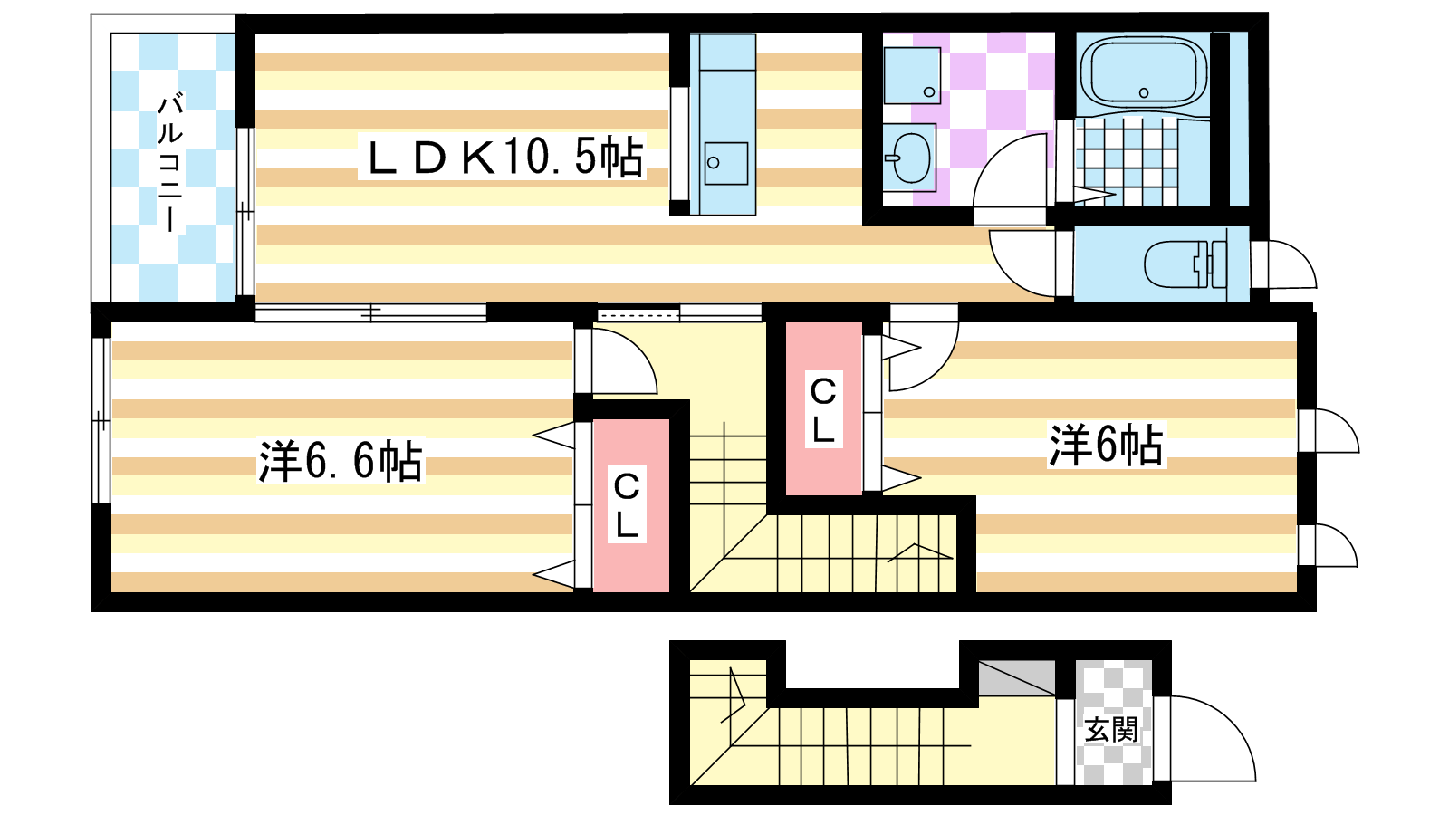 - LDK10.5帖、洋室6.6帖、洋室6帖