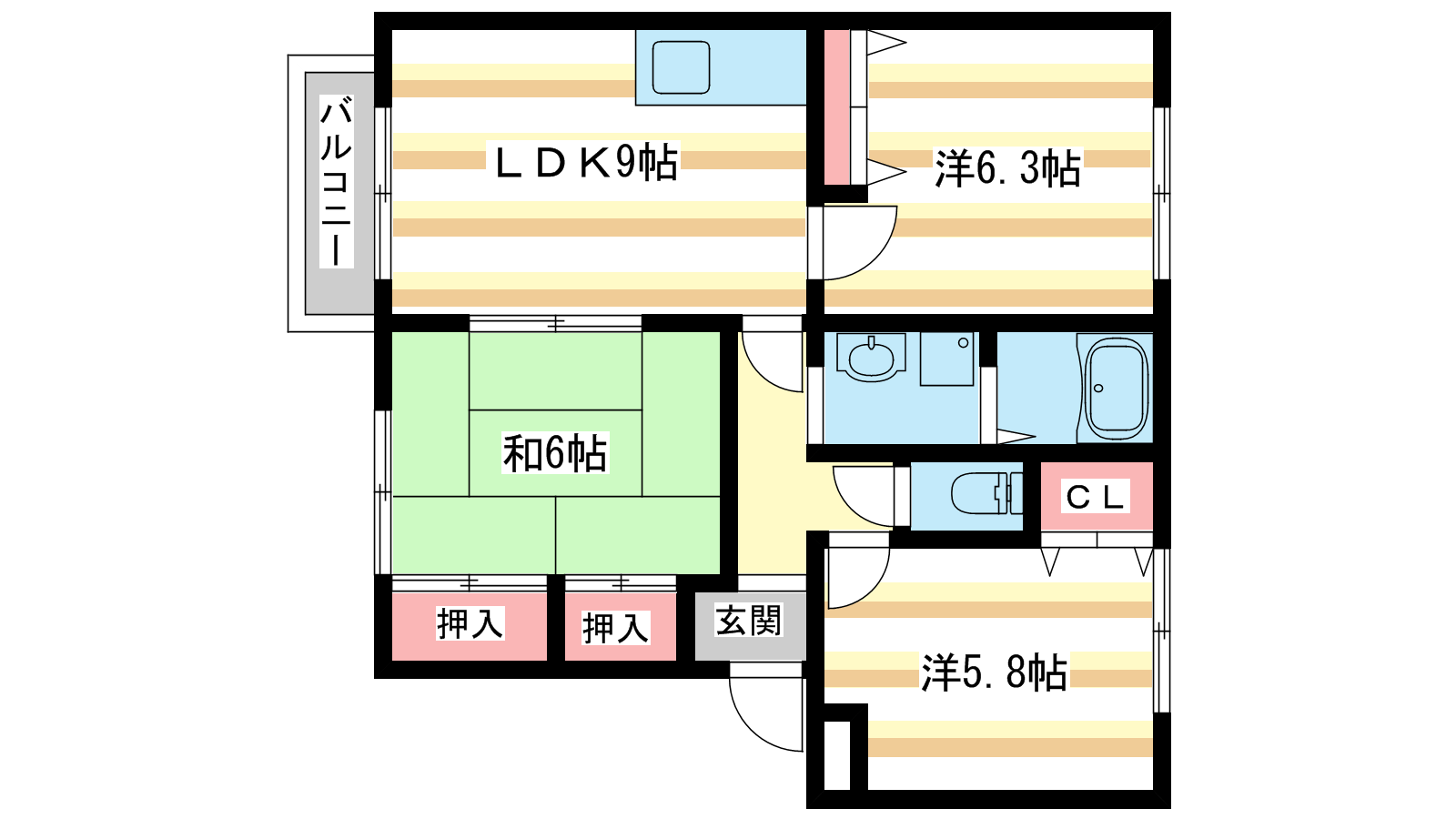 - 洋室5.8帖、洋室6.3帖、和室6帖、LDK9帖