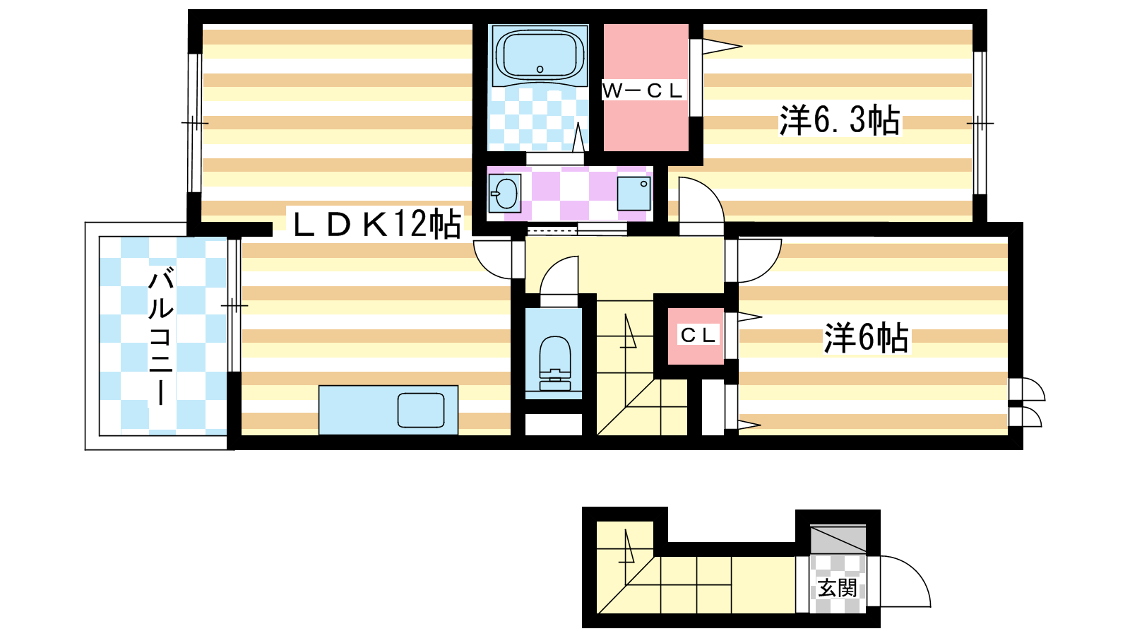 - 洋室6.3帖、洋室6帖、LDK12帖