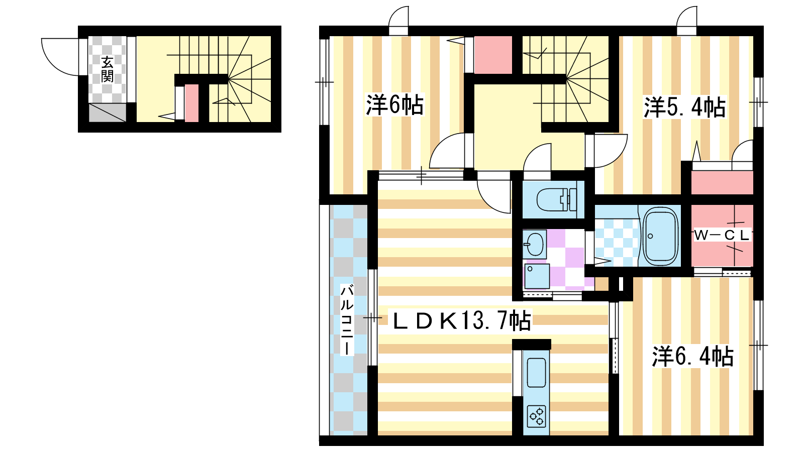 - LDK13.7帖、洋室6.4帖、洋室6帖、洋室5.4帖